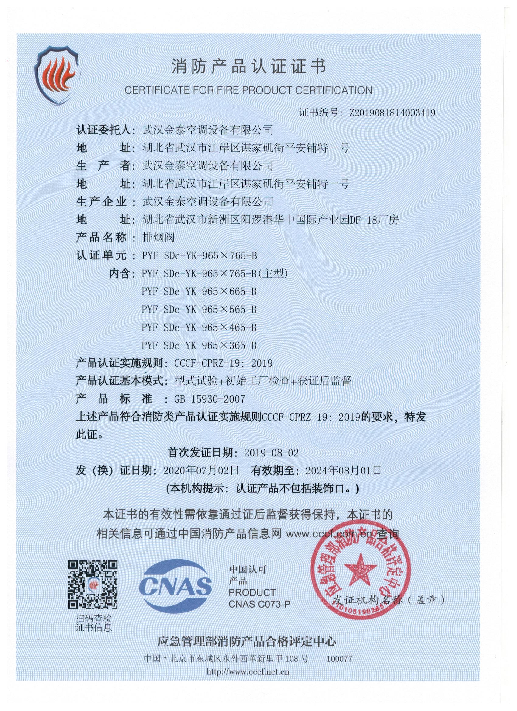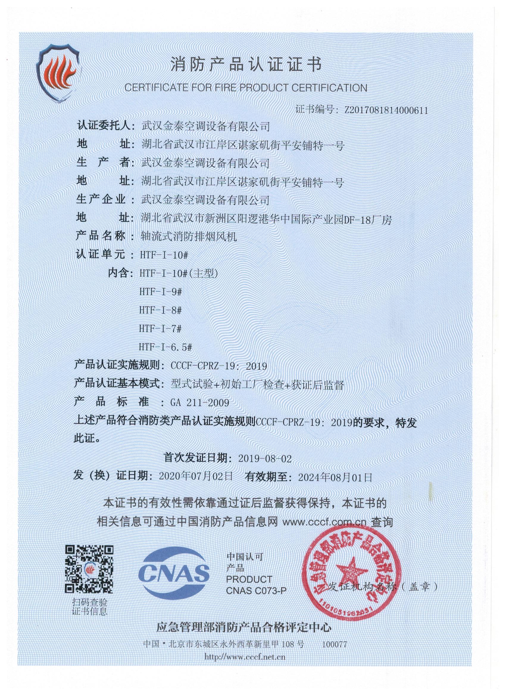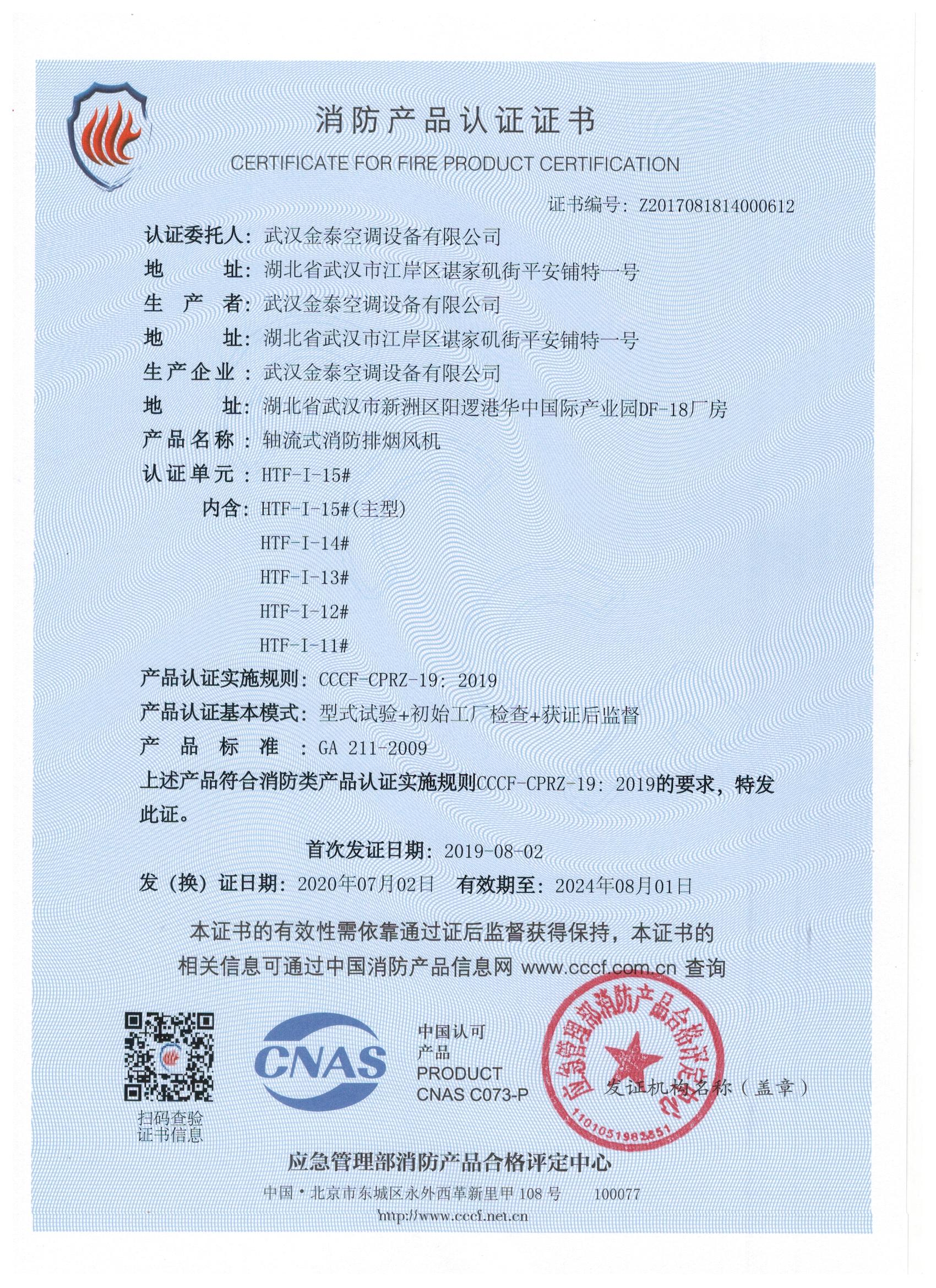 武漢金泰空調設備有限公司 是國內長期專注于民用風機、工業(yè)風機領域的標桿企業(yè):專業(yè)生產消防排煙風機系列、排煙防火閥系列、一般通風機系列(軸流式、離心式、屋頂式、壁式、隧道式、射流式)、風口、風管等消防及通風設備。產品經公安部消防產品合格評定中心評定符合消防產品CCC標準;經中國合格評定國家認可委員會認證的檢驗所檢驗合格;經國家防火建材質量監(jiān)督檢驗中心(四川中心)火燒實驗,耐火性能達標。